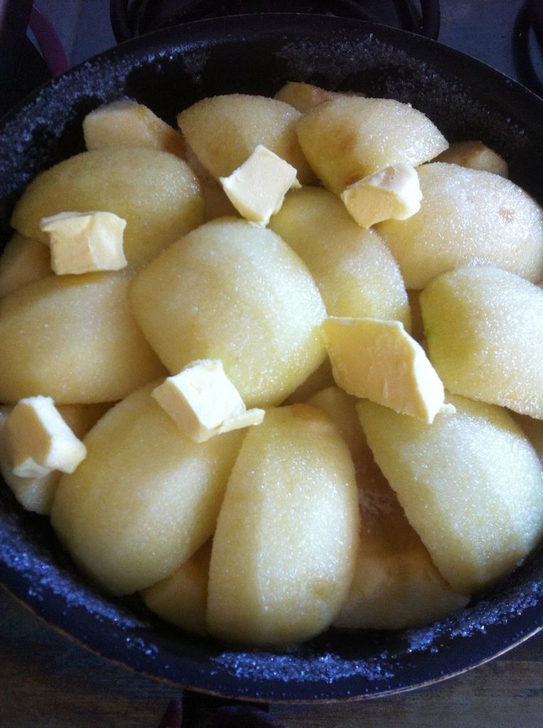 Disposer alors les pommes que l'on aura au préalable épluchées, dénoyautées et coupées en 4.